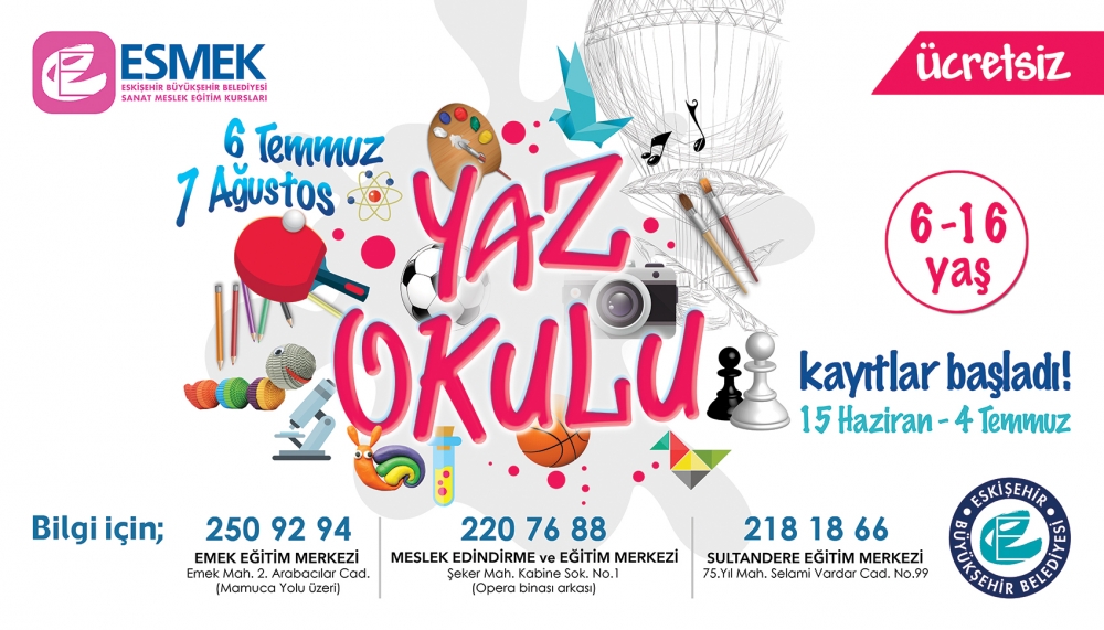 Eskişehir Büyükşehir Belediyesi Meslek Edindirme Eğitim Merkezleri Kurslarının 4 Eğitim Merkezinde düzenlediği Yaz Okulunda 650 ye yakın öğrenci çok sayıda eğitici-öğretici faaliyetle hem öğrenerek hem de eğlenerek tatillerini en güzel şekilde değerlendiriyor.
