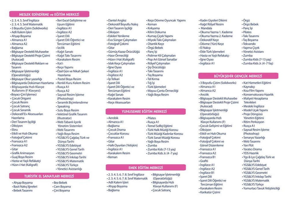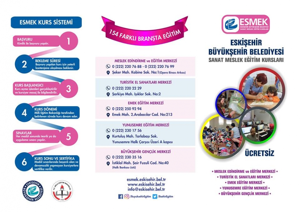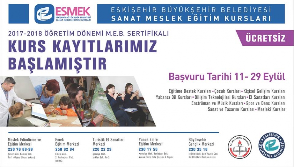5 farklı merkezde 154 branşta verilecek 2017-2018 Öğretim Dönemi ESMEK kayıtlarımız başlıyor.