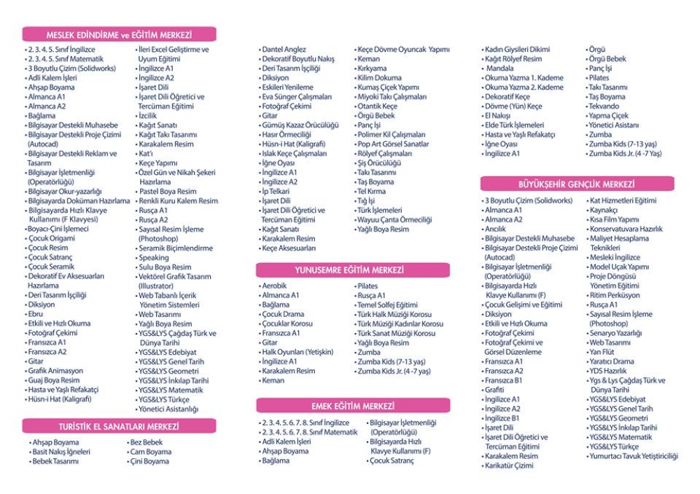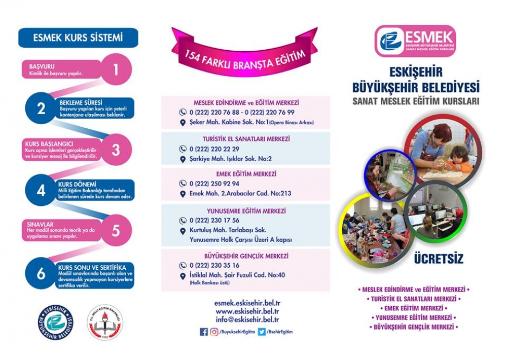 14 yıldır 7’den 70’e binlerce kişiye sanat ve meslek eğitimi veren ESMEK, 2017-2018 eğitim dönemini ücretsiz olarak 5 farklı merkezde vereceği 154 branş ile sürdürecek. 11 Eylül tarihi itibari ile 5 farklı noktada başlayan kayıt işlemleriyle Eskişehirliler dilediği kursa ücretsiz olarak kayıt yaptırabilecek. Eğitim destek kurslarından çocuk kurslarına, kişisel gelişim kurslarından yabancı dil kurslarına, bilişim teknoloji kurslarından el sanatları kurslarına kadar birçok branşta verilecek eğitimler sonunda başarılı kursiyerlere Milli Eğitim Bakanlığı’ndan onaylı sertifikası verilecek.