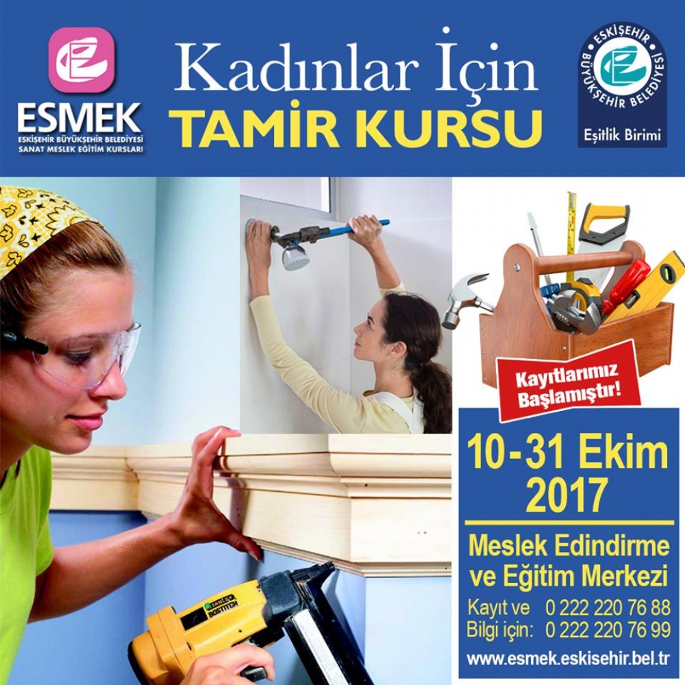 Toplumsal cinsiyette eşitlik sağlamak amacıyla Eşitlik Birimimiz tarafından düzenlenecek olan 'Kadınlar için Tamir Kursu' kayıtlarımız başlamıştır. 10-31 Ekim tarihleri arasında ESMEK Meslek Edindirme ve Eğitim Merkezinde düzenlenecek kurs hakkında bilgi almak ve kayıt yaptırmak için 0222 220 76 88'i arayabilirsiniz.