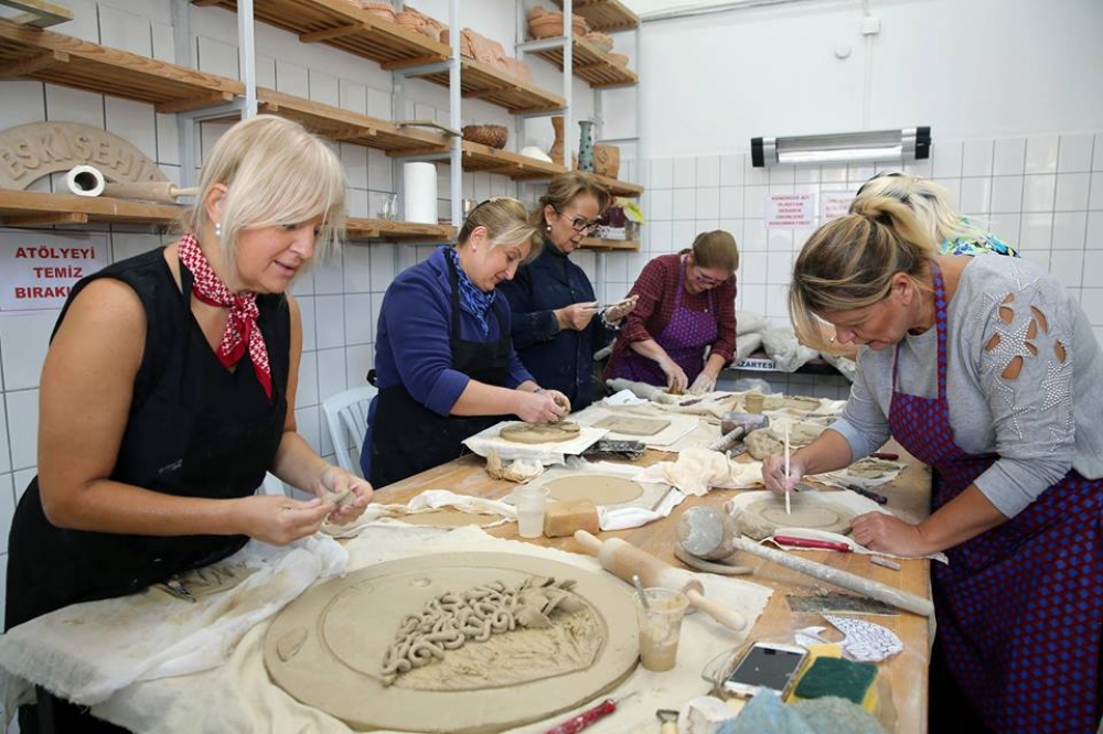 Eskişehir Büyükşehir Belediyesi Sanat Meslek Eğitim Kursları’nda (ESMEK) eğitimler tüm hızıyla devam ediyor. Seramik derslerine katılan vatandaşlar el becerileri ile çamura yeni şekiller vererek keyifli vakit geçiriyorlar. Alanında uzman eğitmenlerden eğitim alan kursiyerler düşlerinde tasarladıklarını çamura yansıtarak birbirinden başaralı eserler ortaya çıkarıyorlar.