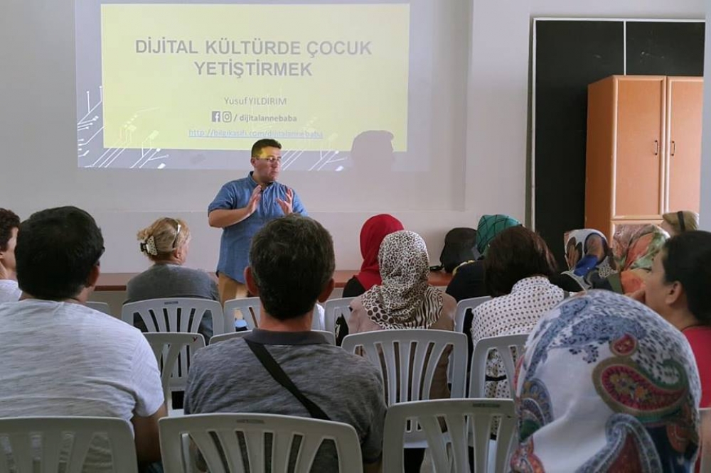 Büyükşehir Belediyesi Sanat Meslek Eğitim Kursları (ESMEK) tarafından bu sene 16’ıncısı düzenlenen ve Meslek Edindirme Eğitim Merkezi ile Emek Eğitim Merkezi’nde düzenlenen Yaz Okulları’nda eğitimler devam ediyor. 7- 14 yaş arasındaki çocuklar el sanatlarından seramiğe, zumbadan cimnastiğe, ebrudan kağıt atölyesine, birbirinden farklı ve eğitici 26 farklı branşta eğitim alırken öğrencilerin velileri de farkındalık yaratmak amacıyla bilgilendiriliyor. Büyükşehir Belediyesi Sanat Meslek Eğitim Kursları Merkezi’nde düzenlenen ve Yusuf Yıldırım tarafından ebeveynlere verilen eğitimlerde ekran bağımlılığına karşı yapılması gerekenler ve dijital kültürde nasıl çocuk yetiştirilmesi gerektiği konusunda bilgiler verildi. Yıldırım “Sosyal vakit geçirebileceğimiz televizyon, bilgisayar, telefon gibi tüm ekranların kapatıldığı “Ekransız Saatler” düzenlemeliyiz. Anne ve babalar çocuklarını ekrana mahkûm etmemeli” dedi.
