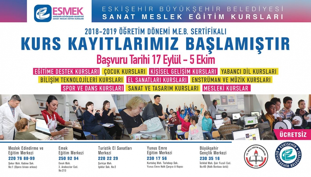 🔔 Eğitim destek kurslarından çocuk kurslarına, kişisel gelişim kurslarından yabancı dil kurslarına, bilişim teknoloji kurslarından el sanatları kurslarına kadar yaklaşık 170 branşta ücretsiz eğitimlerin verileceği ESMEK 2018-2019 Döneminde kayıtlar başlıyor.