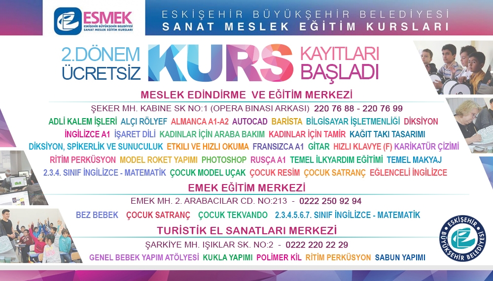 ESMEK Eğitim Merkezlerinde kaydı devam eden kursları, gün ve saatlerini web sayfamızdan ''Aktif Kurslar'' bölümünden takip edebilirsiniz.