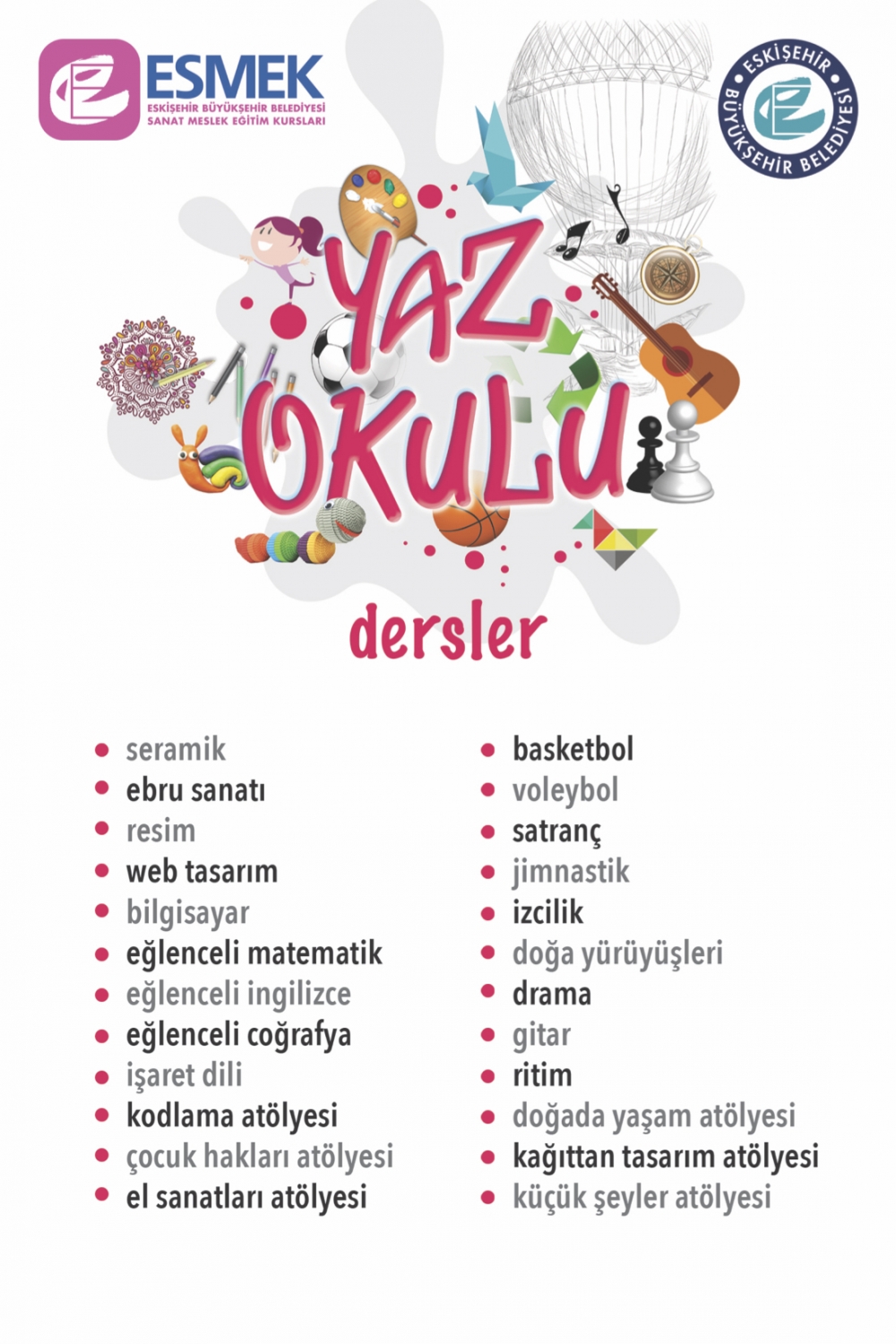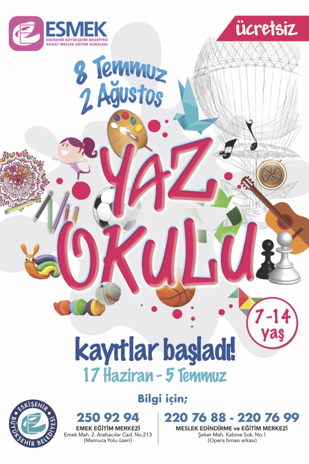 Aydınlık yarınlarımızın teminatı olan çocuklarımızın yaz tatillerini en verimli şekilde geçirebilmeleri amacıyla ESMEK, 24 farklı branşta ücretsiz Yaz Okulu kayıtlarımız başladı.