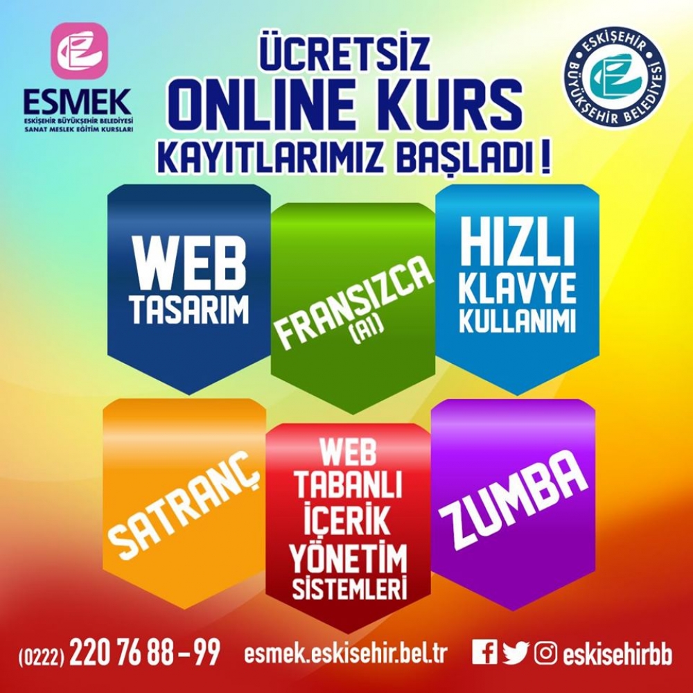 6 farklı alanda gerçekleştirilecek kurslara kayıt olmak için 0222 220 76 88-99'u arayabilir veya www.esmek.eskisehir.bel.tr/online üzerinden kayıt oluşturabilirsiniz.