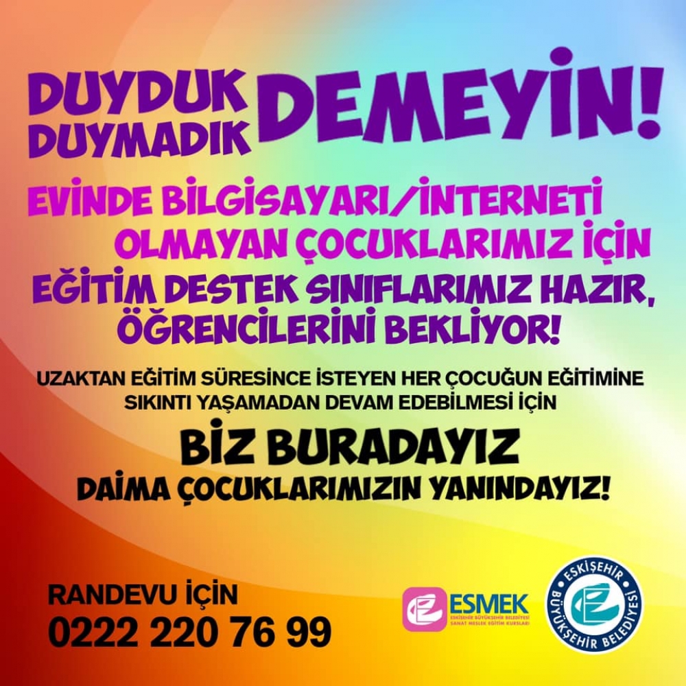Sevgili çocuklar, kıymetli ebeveynler, evinde bilgisayarı veya interneti olmayan çocuklarımız için eğitim destek sınıflarımız hazır!
