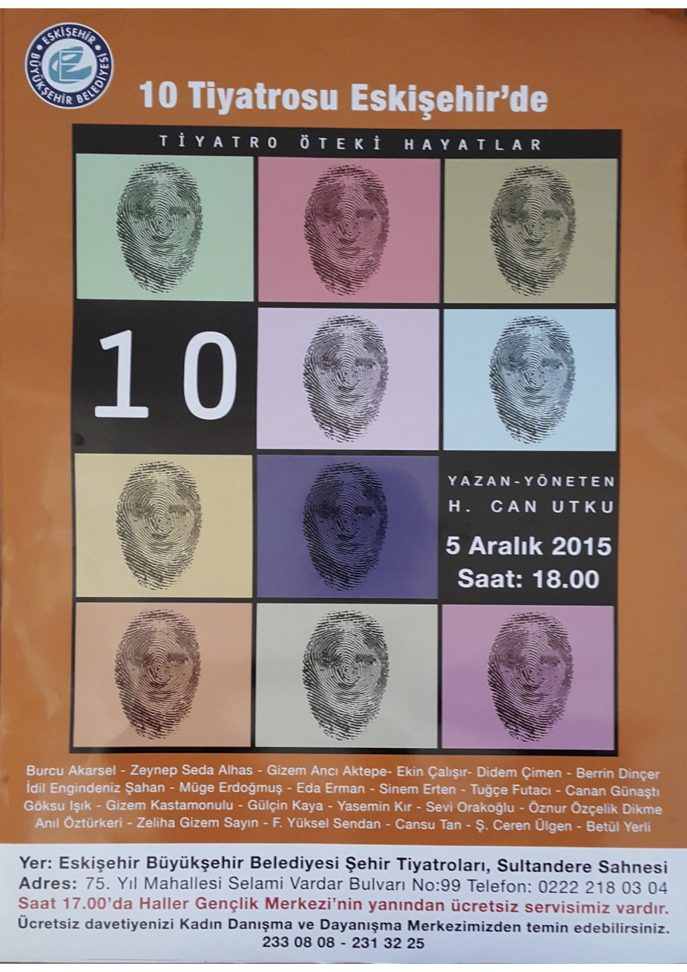 10 Tiyatrosu Eskişehir'de "Tiyatro Öteki Hayatlar"(Kadınlar için)17.30 Kokteyl.18.00 Açılış.Eskişehir Büyükşehir Belediyesi Şehir TiyatrolarıSultandere Sahnesi