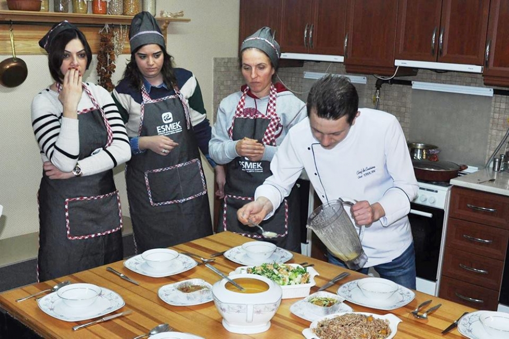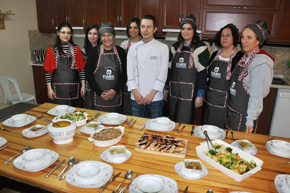ESMEK tarafından yeni yıl gecesi için hazırlanacak Yeni Yıl Yemekleri Kursuna katılan ve aralarında akademisyen, öğretmen, güzellik uzmanı, emekliler ve ev hanımlarının bulunduğu 12 kişilik grup ESMEK Sultandere Mutfak Stüdyosundaki eğitimlerini tamamladı. Şef Onur Karaçam tarafından verilen Yeni Yıl Yemekleri kursunda kursiyerler yeni yıl gecesi için hazırlanacak menüleri ve farklı yemeklerin nasıl hazırlandığını öğrendiler.
