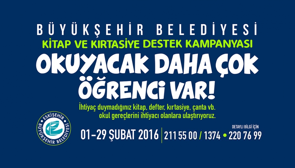 Eskişehir Büyükşehir Belediyesi Sosyal Hizmetler Daire Başkanlığı eğitim desteklerine bir yenisini daha ekledi. 1 Şubat – 29 Şubat tarihleri arasında Kitap ve Kırtasiye Destek Kampanyası başlatan Büyükşehir Belediyesi, kampanya sonunda toplanan eğitim malzemelerini ihtiyacı olan öğrencilere dağıtacak.